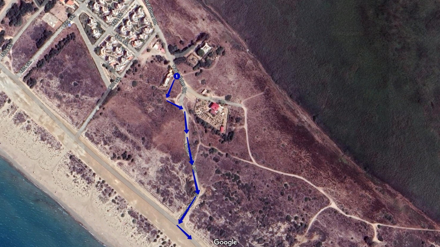В пустынной части Kum Mahallesi (если смотреть по карте выше то она справа) находится большая заповедная зона, куда приплывают морские черепахи оставить своё потомство, поэтому большая часть пляжа не застроена, дикая и пустынная.