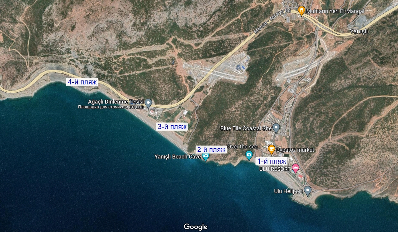 Конкретных названий этих пляжей найти не удалось, поэтому назову их по названию близлежащего населённого пункта Yanışlı: на первом пляже располагается отель ULU RESORT HOTEL, 2-й и 3-й пляжи располагаются в 500 метрах от первого пляжа. Четвёртый пляж находится впритык к дороге, добраться к нему можно лишь спустившись по крутому склону.