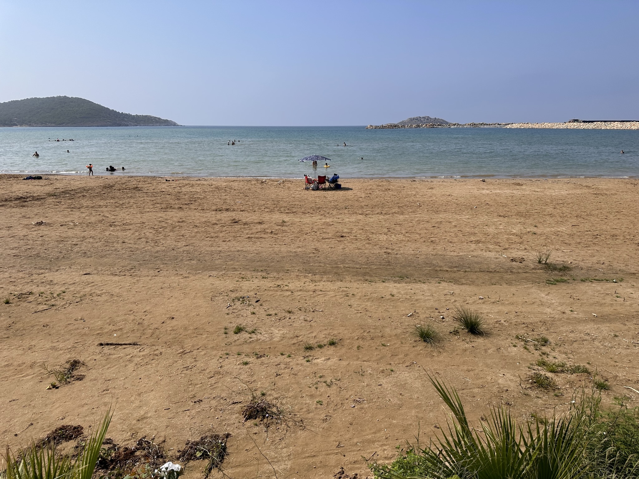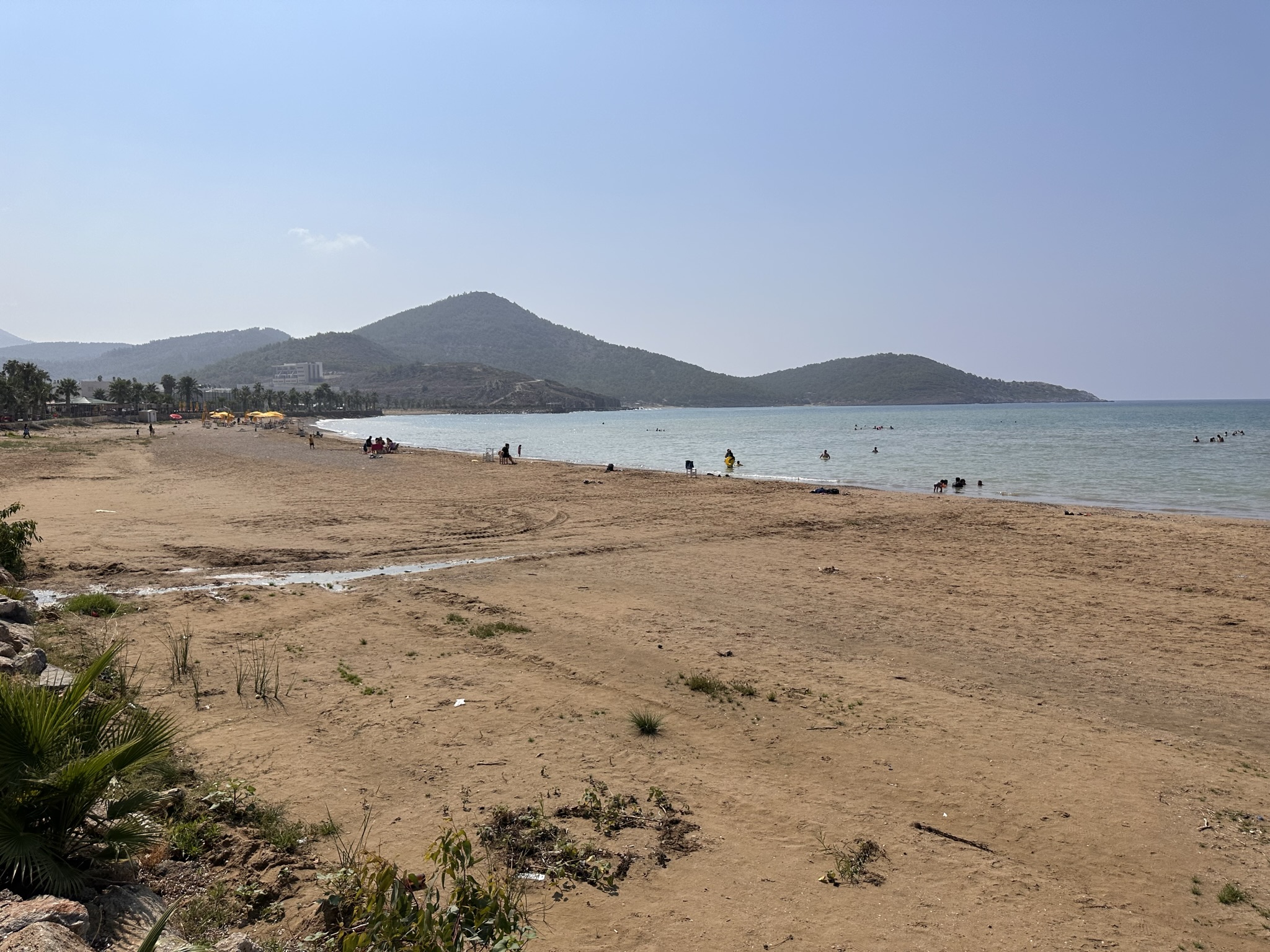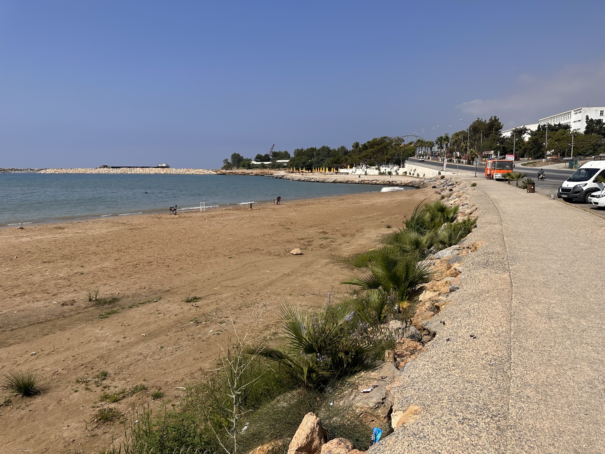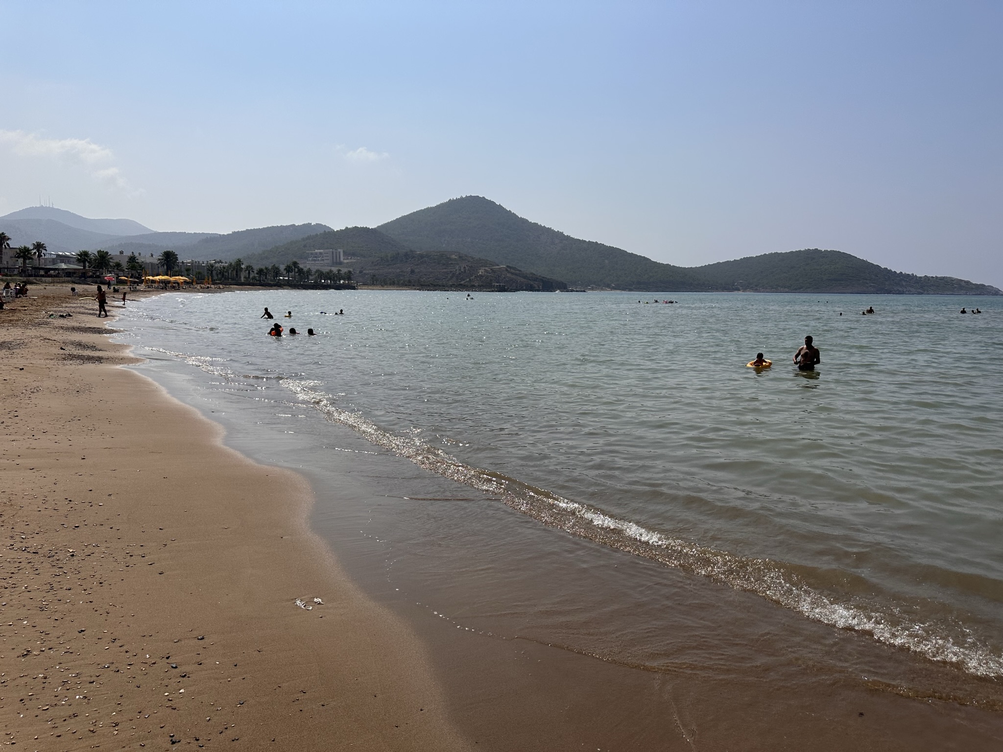 Широкий песчаный пляж, песок больше похож на речной. Вода у берега мутноватая из-за песка. Есть платные шезлонги и зонты. Вокруг много кафе и магазинов. Отдыхающих мало, туристы сюда заглядывают редко, в основном по дороге из Антальи в Мерсин.