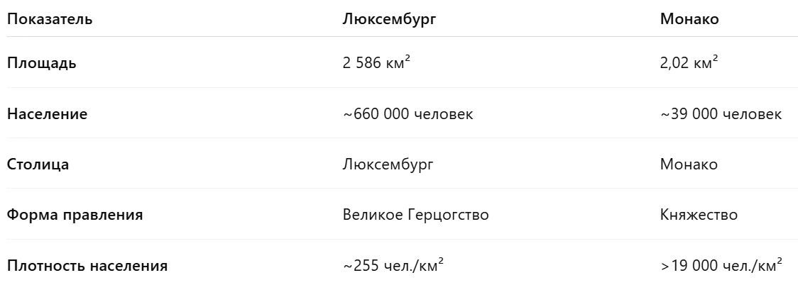 Люксембург и Монако — два известных европейских государства, которые часто ассоциируются с небольшими размерами и высоким уровнем благосостояния. Но насколько они действительно малы, и какая из этих стран больше? Давайте сравним их по основным показателям.