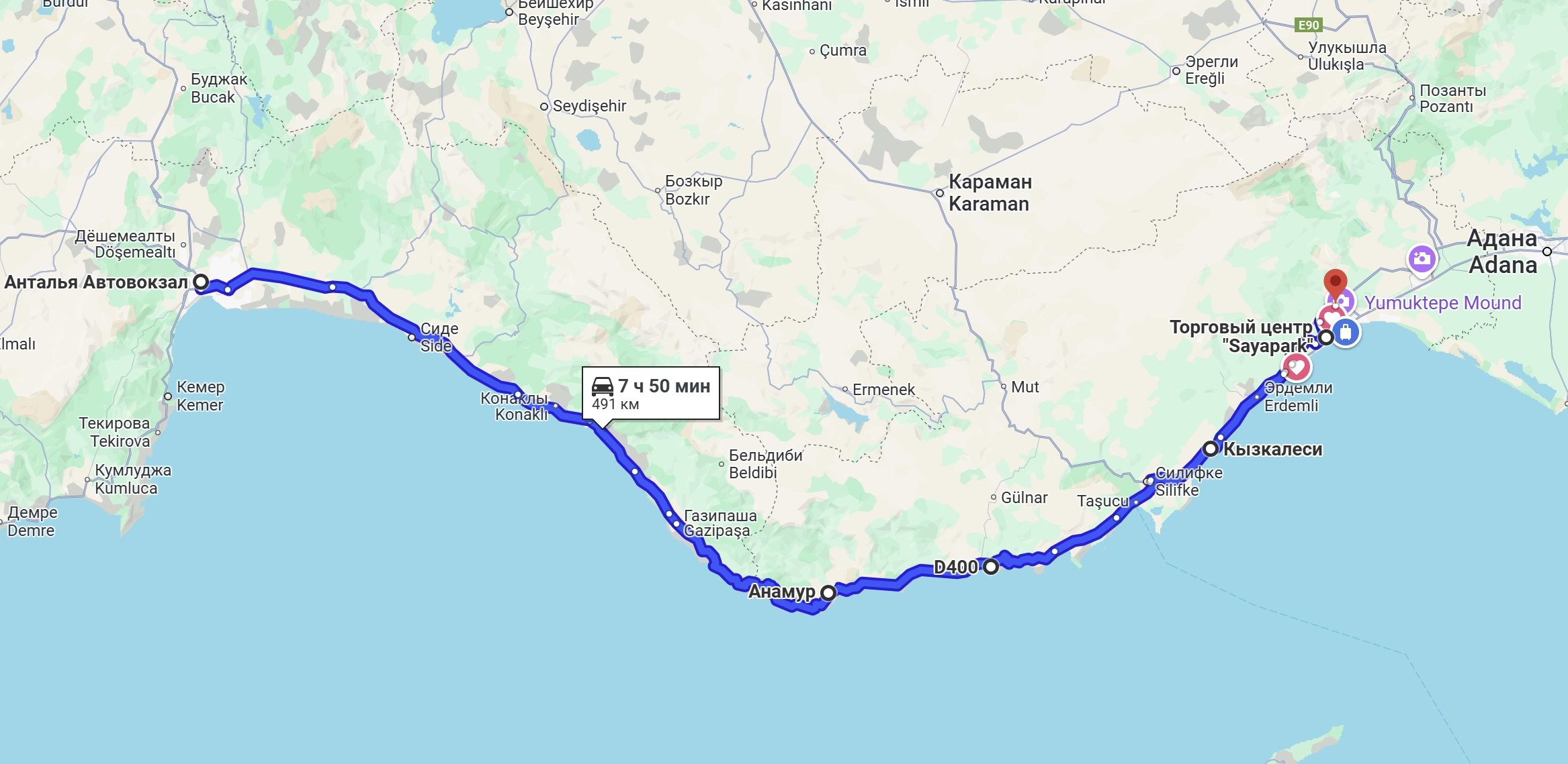 Дорога из Анталии в Мерсин местами узкая — горные серпантины, проходит через множество населенных пунктов, поэтому эти 490 км не проехать. Сейчас активно строятся новые тоннели, но до их открытия ещё далеко. На машине обычно минимум 7-8 часов уходит, на автобусе — 8-10 часов.