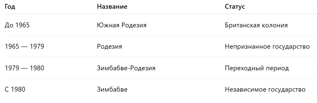1979–1980 годы — в переходный период перед официальным признанием независимости страна называлась Зимбабве-Родезия (Zimbabwe-Rhodesia), но вскоре снова вернулась под британское управление для подготовки к свободным выборам.