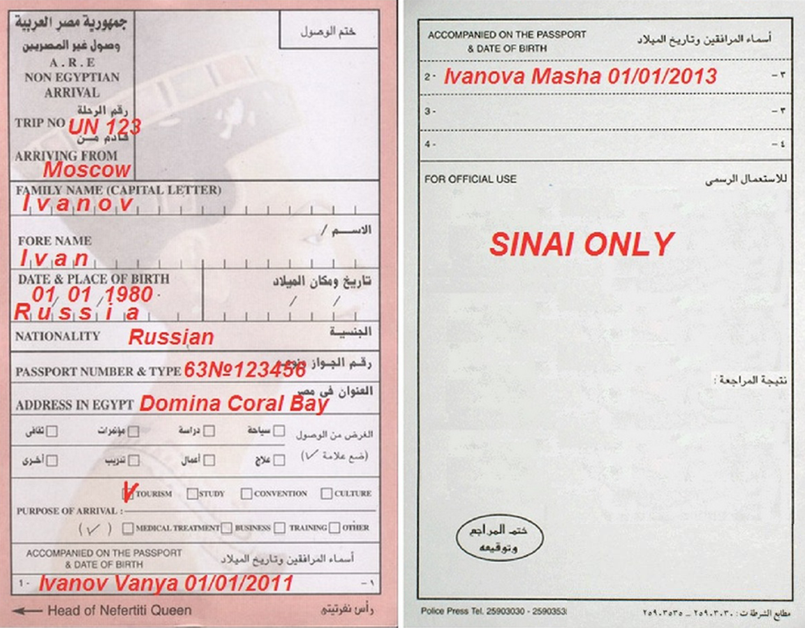 По прилёте в Шарм-эль-Шейх, а также при переходе границы с Израилем (КПП Таба) россияне могут получить бесплатную визу на 15 дней, также известную как «синайский штамп».
